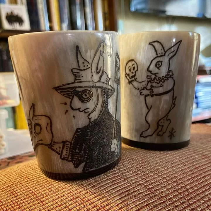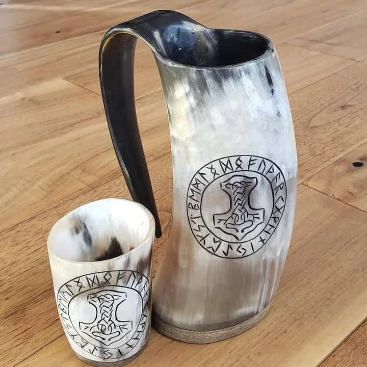 Drinking Beer Mug Natural Horn 2 Piece Set Unique Style Print